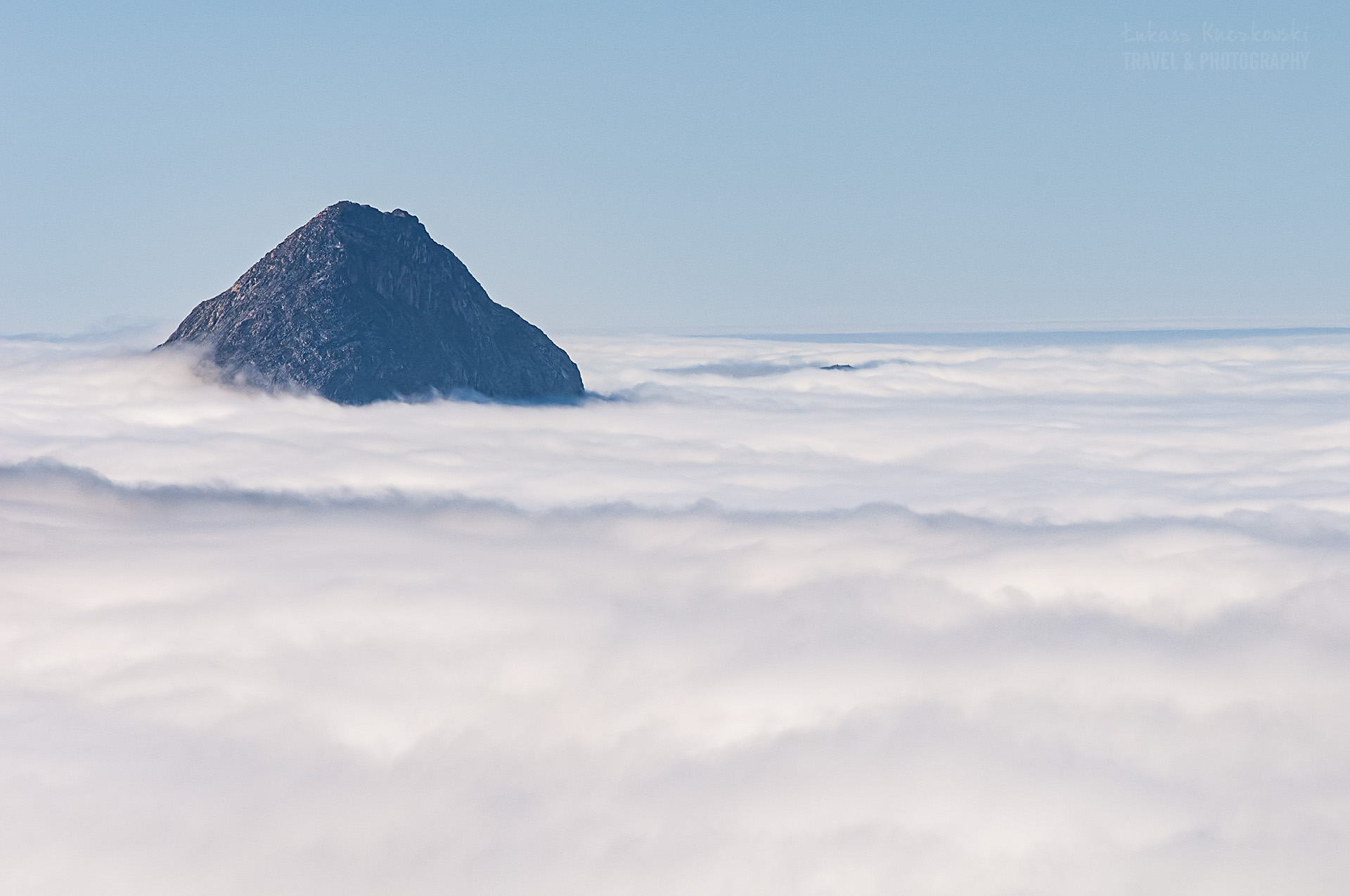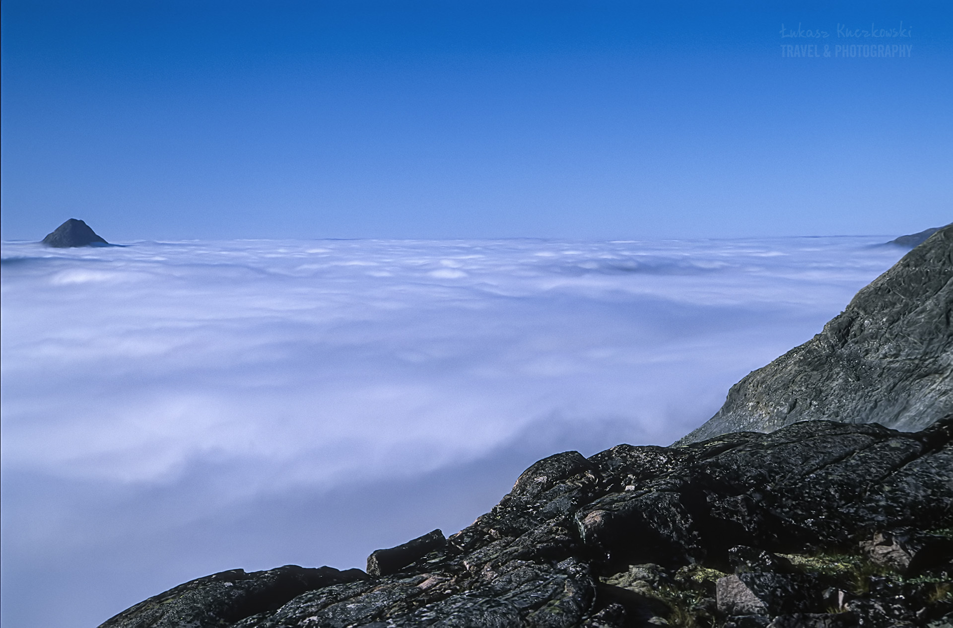 No i stało się. Adam nas nie obudził. Ja wstałem o 6 rano sam i wszystko u moich stóp było przykryte chmurami. Widok był fantastyczny, ale na pewno wyglądało to o niebo piękniej o wschodzie słońca. A tak, słońce już było wysoko i była przysłowiowa d…a. Ależ byłem zły. Posiedziałem sobie z godzinę kontemplując widoki. Dokumentalnie nawet pstryknąłem kilka zdjęć. Ale to nie było to. Najlepszy jak na razie wschód przeszedł mi koło nosa.