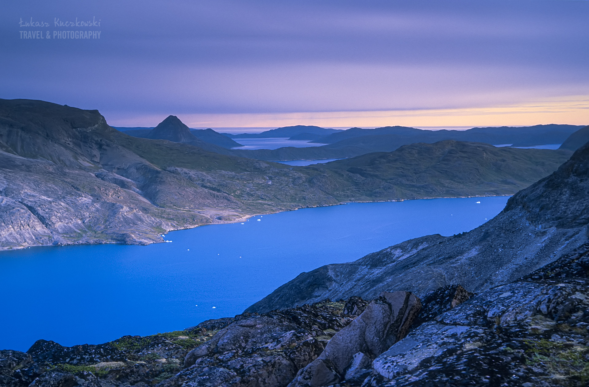 Na zachód wychodzimy na pobliskie wzgórze – jakieś 150 metrów nad naszą bazą. Idzie się jak po grudzie – nie ma żadnej ścieżki, a często jest czysta skała, która często kończy się pionową ścianą. Ale wreszcie osiągamy szczyt. Widoki są jeszcze lepsze – otwiera się bowiem druga strona półwyspu i widać stąd odległe, ostre szczyty i granie. Chciałoby się wejść jeszcze wyżej, ale w pobliżu niczego wyższego nie ma. Robię trochę zdjęć. Światło jest ciepłe i koloryzuje wszędobylskie kamienie. Chmury przybierają różowy kolor. Szkoda tylko, że są nie w tym miejscu, w którym być powinny. Ale trudno. Na szczycie możemy odetchnąć od muszek i komarów – tu ich nie ma. No ale w końcu to prawie północ, więc powinny już spać. Jest zimno. Jestem ubrany we wszystko co mam, ale i tak czasami czuję chłód. Od morza ciągną niskie chmury, które przewalają się przez granie i wszystko wypełniają mlekiem. Ich postęp jest naprawdę szybki. O wschodzie możemy być zatem nad chmurami, co zapowiadałoby nieziemski spektakl. Postanawiamy zatem wstać na wschód. Tym razem Adam ma nas obudzić.