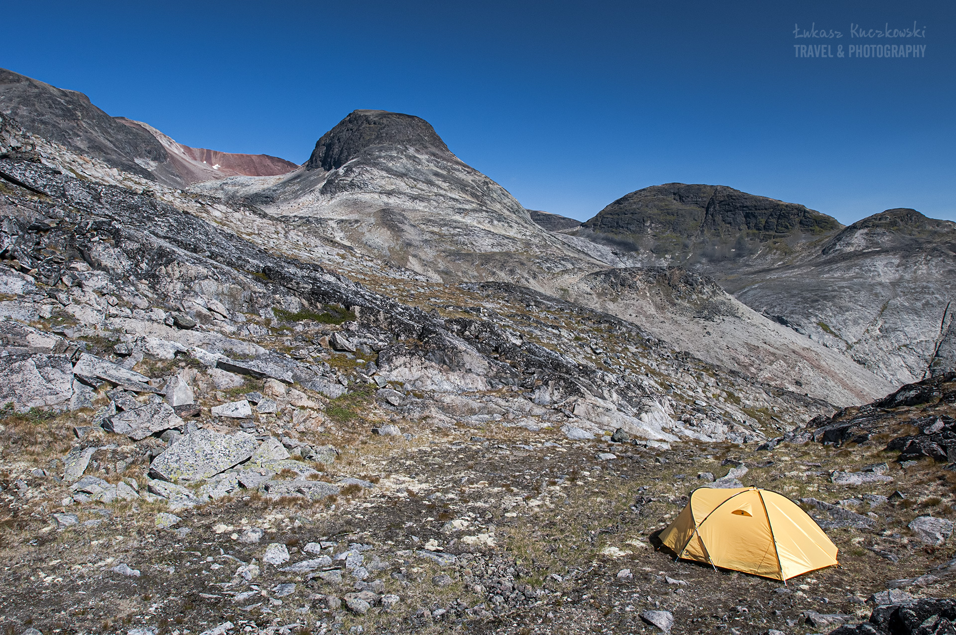 Nie ma chmur, więc nie wstaję na wschód. Długo śpimy, aż w namiocie robi się gorąco do słońca. Jesteśmy bowiem całkowicie odsłonięci, w pobliżu nie ma skrawka cienia. A wiatr gdzieś znikł w czeluściach okolicznych gór.