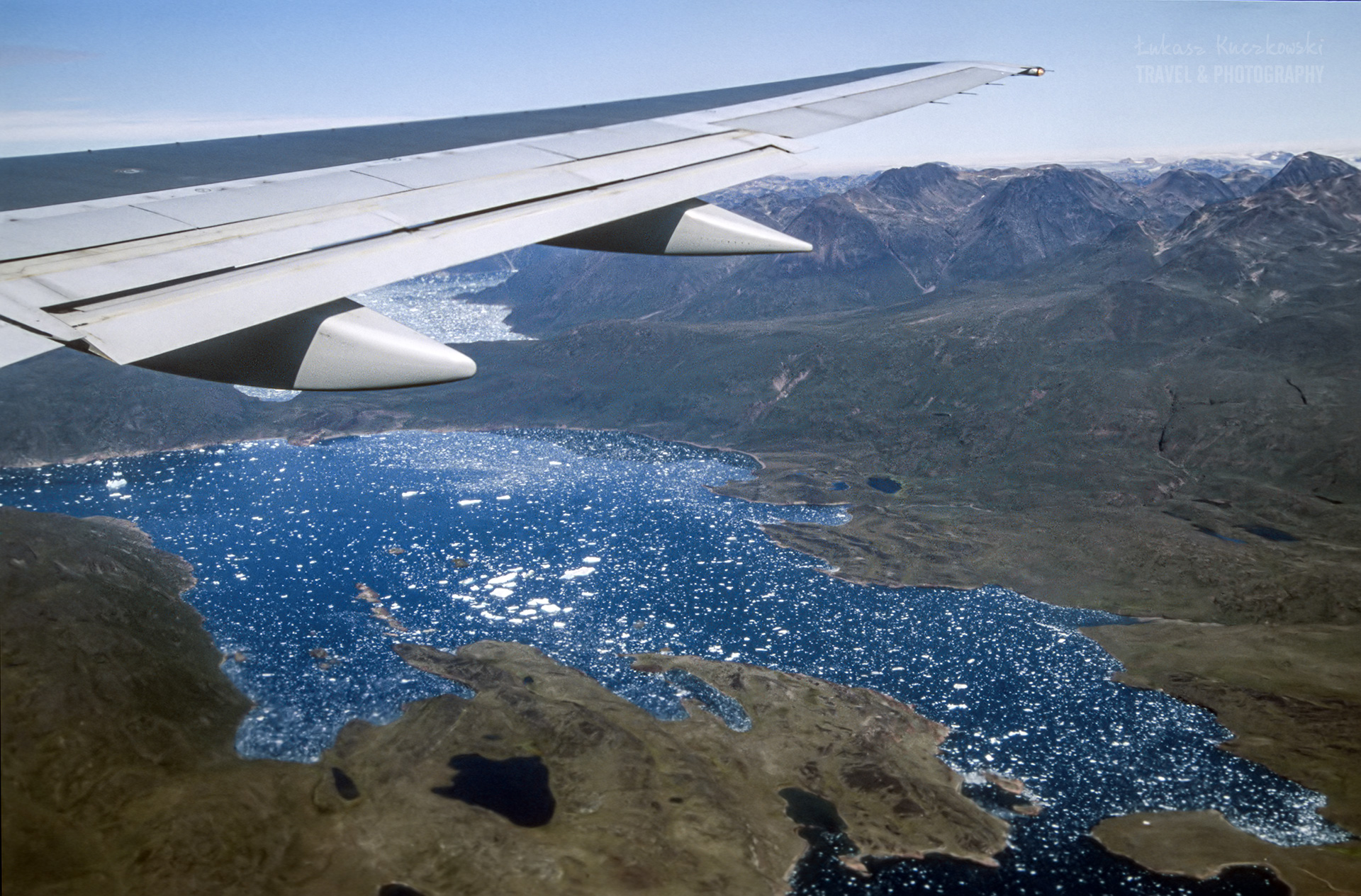 Sam lot był długi i męczący. Jakoś nie mogłem spać – zapewne z ekscytacji. Na szczęście samolot był pusty w ½ co oznaczało wiele pustego miejsca i jako taką wygodę. Najpierw wypatrywałem Islandii – niestety była przykryta chmurami, później wypatrywałem gór lodowych. Przeczytałem wszystko co było na pokładzie samolotu w języku angielskim i było dostępne dla pasażerów. Moje „wyglądanie” przez okno wreszcie przyniosło rezultaty. Zacząłem dostrzegać góry lodowe na wschodnim wybrzeżu Grenlandii. Początkowo niewielkie, ale później coraz większe. Wreszcie ukazało sięsamo wybrzeże Grenlandii otoczone niezliczoną ilością mniejszych i większych gór lodowych. Wyglądało to fantastycznie. Jaka szkoda, że nie można się wychylić i zrobić kilku zdjęć bez pośrednictwa brudnego pleksi w oknie.