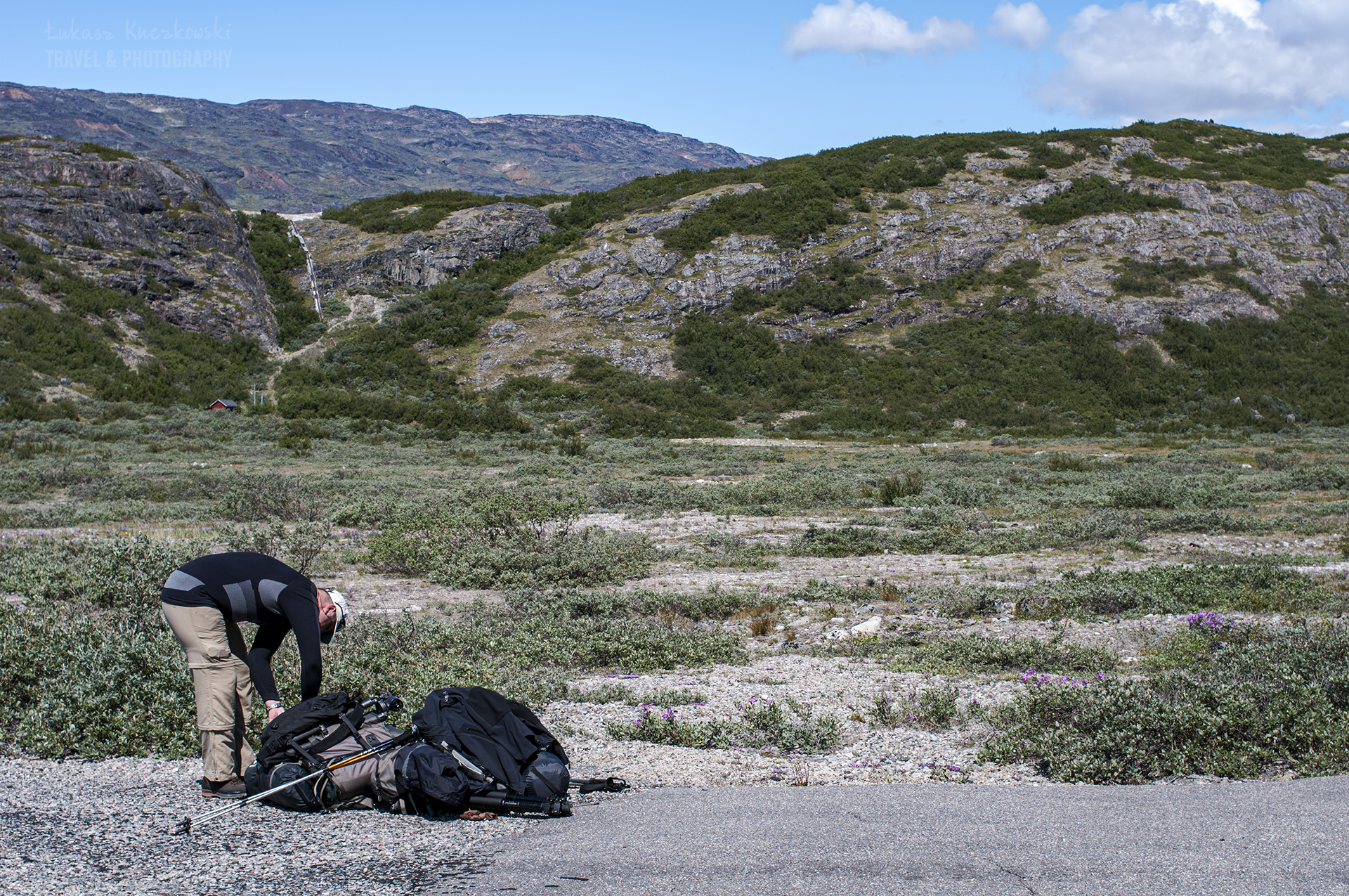 Ruszyliśmy, z naszymi ciężkimi plecakami na ramionach. Przez następne trzy dni mieliśmy eksploatować okolice Narsarsuaq – takie przygotowanie przed właściwym trekkingiem. Ciepło było niemiłosiernie – początkowo, przez prawie 3 km droga wiedzie asfaltem. Następnie asfalt urywa się i ścieżka wchodzi w przesmyk pomiędzy wzgórzami. Po kilkunastu minutach docieramy do Flower Valley – Doliny Kwiatów. Rzeczywiście, zgodnie z nazwą cała dolina u naszych stóp pokryta jest kobiercem kwiatów i zielonej trawy. W oddali wije się rzeka Kuusuaq, która swoje źródła ma w topniejącym niedaleko lodowcu Kuussuup.